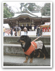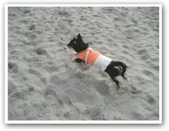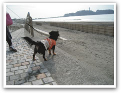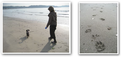 広い砂浜に興奮ぎみのはなちゃん。冬なので人はまばら。
