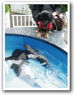 イルカがはなちゃんに興味深々。じっくりはなちゃんを観察。
